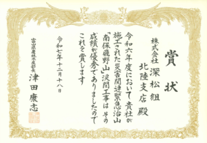 富山県農林水産部長 津田 康志 様より、弊社が令和6年度に施工した『災害関連緊急地山「南保飛野山」渓間工事』について、優良工事表彰を受彰しました。